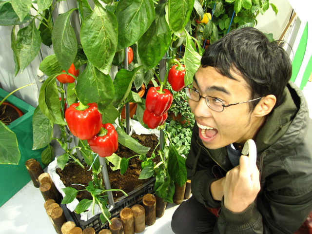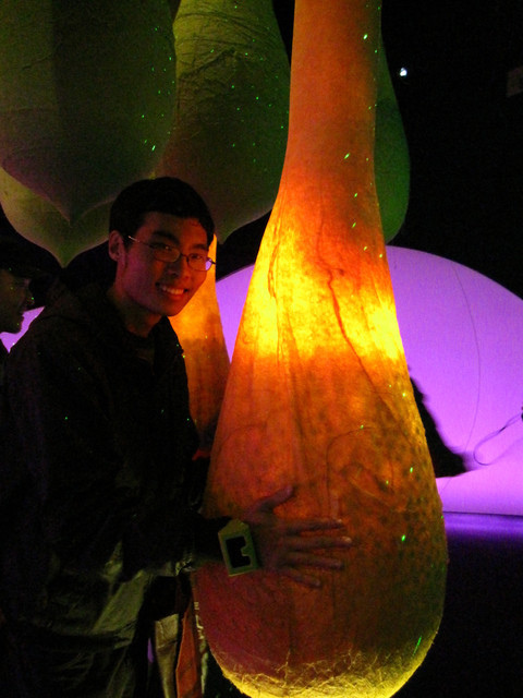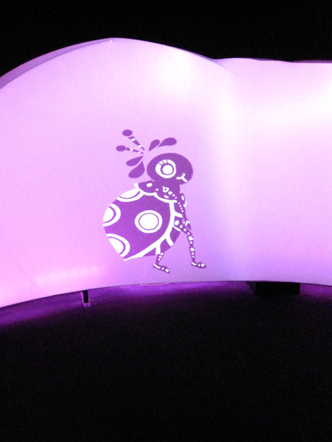 這是我變成昆蟲的模樣!這部份是要體驗轉變成昆蟲,然後替花授粉,這就是我們的角色,當你經過這裡,投影幕上的你就會由人逐漸變成昆蟲!